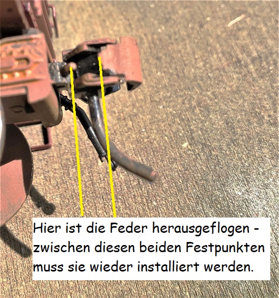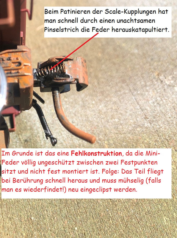Wer sich das prinzipiell mit der Federsuche ersparen will, kann auch die Kupplung 740 aus dem Kadee Programm benutzen. Die ist vorbildlicher gestaltet und die Klauenfeder ist verdeckt, so dass die nicht weghüpfen kann.